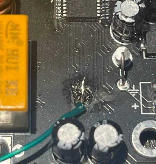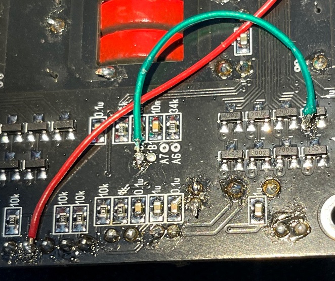 In the existing design, pin 11 is used for the capacitor I/O relay (this switches the capacitor bank between the input and output side of the inductors). To free up this pin, I cut the track on the top of the board that goes to the bottom left Via, then on the bottom of the board I put a lead between the B0 pad and the Gate of the I/O relay FET. To connect to PIC pin 11, I scraped some of the solder resist from the track and soldered the output of the 74HC393 to it.