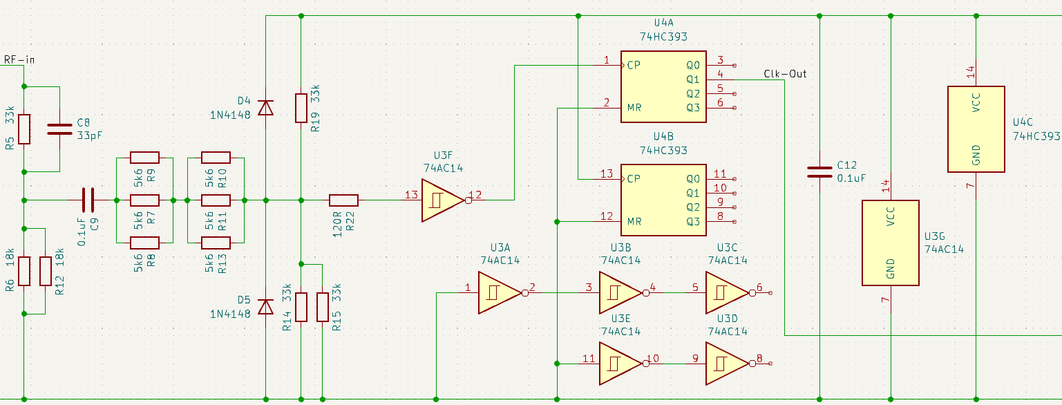 With the 74AC14 and 74HC393, and the expanded resistor values we get this:
