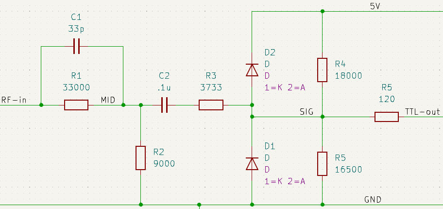Component list: I spent some time tuning the values, I was aiming for the full voltage swing required by the 74AC14 from 1.5MHz to 55MHz with 20V pk-pk in (about 4W). I also wanted to limit the number of high wattage resistors (I don't have many value in my resistor boxes), also it's wasted power! With these values it can cope with 150V pk-pk, which is about 225W.