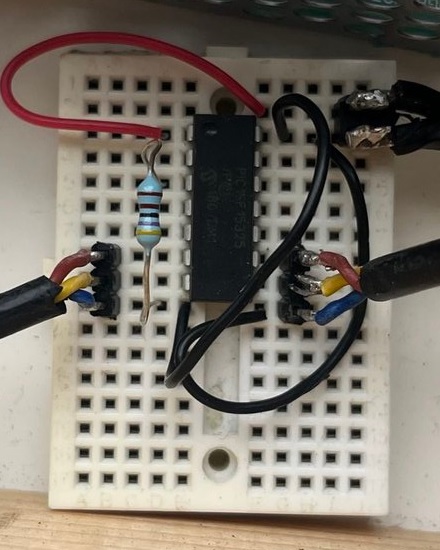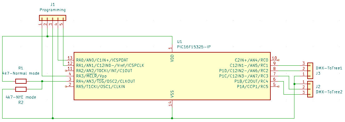 The PIC16F15325 does all the work, the top connector is from a 5V power supply, the lower ones are the differential signalling to the trees. The resistor switches between normal patterns, and a New Year's even firework only show.