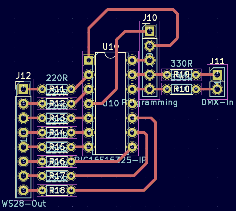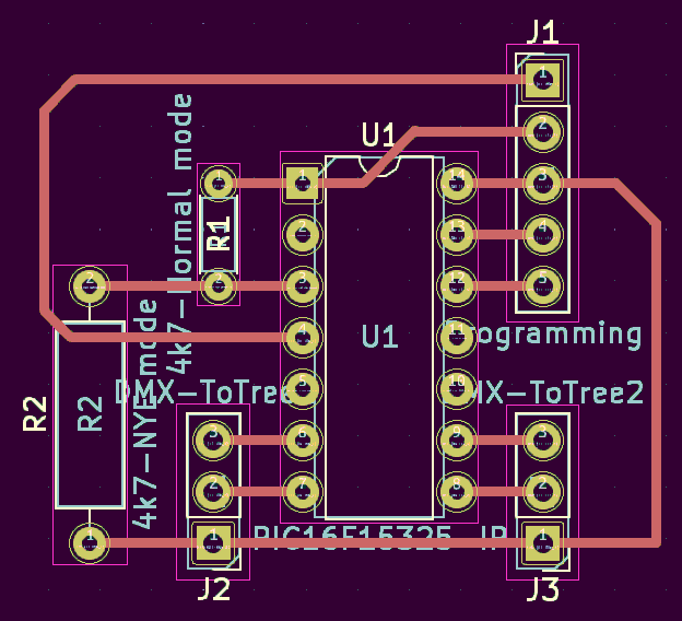R1/R2 select the New Year fireworks, or normal mode. J2/J3 go to the trees. Pins 6/9 are the USART outputs, 7/8 are the inverted versions generated by the CLC blocks. I've not actually made the PCB, so am still using a prototyping board, where I've only fitted the power pins, not the full programming connector.