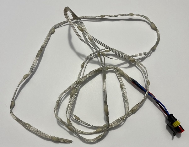 These have 40 WS2812 LEDs epoxied directly onto the cable. They are 10cm spacing, so I've folded the strand in half, so it's 2meters long. The Din pin on the LEDs are quite sensitive, so there is a buffer resistor between the connector and the data in pin, this protects the strings if they are connected up wrong.