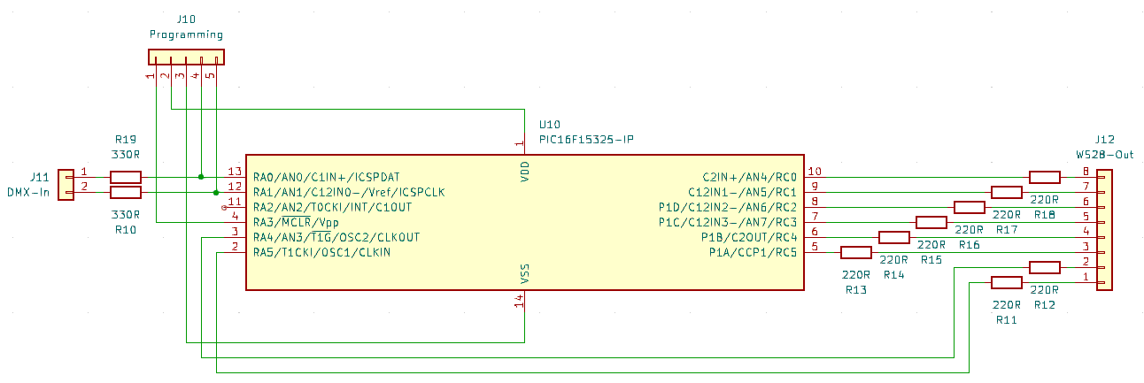 This uses my open source header files, and MPASM (Included for free in MPLAB-X V5.35 and earlier, needs Windows 10 or earlier). dmx_dual.asm is the source code for the house controller, and dmx_rgb.asm is the source code for the tree controller.