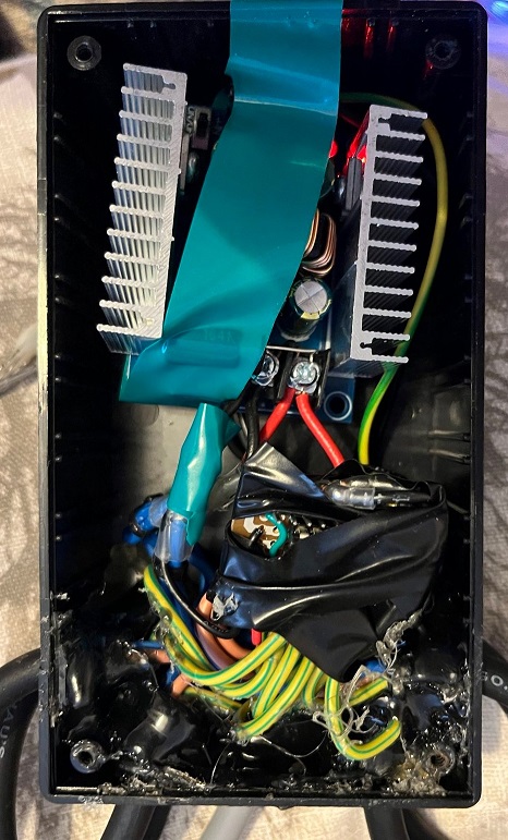 The top block is a 300W DC:DC buck convertor, the lower block is a PIC16F15325 with buffer resistors. The grey cable comes from the house, the 8 black cables go to the strand connectors.