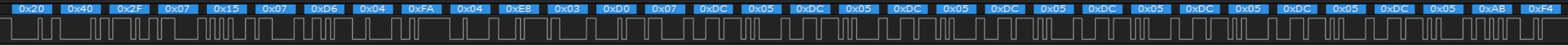 Normal | 58 | 32-bit Tx-ID | FF FF FF FF | 14 blocks of 16-bits stick position (in µSec, Least significant byte first) Channels 1 from Wheel, 2 from throttle, 3...14=Mid pos (1500µSec) |