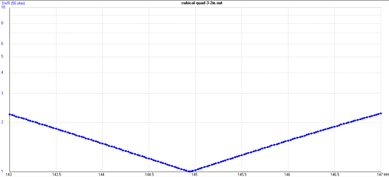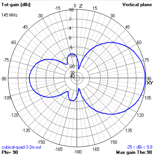 For the cubical quad, there are lots of parameters, and none of the existing web calculators did what I wanted. Given the simple nature of the elements, it was easy to create a model for 4nec2, with some optimising, this is the result for a 3 element beam for the 2 meter band, I'm pretty happy with 9.81dBi forward gain in 1.03meters.